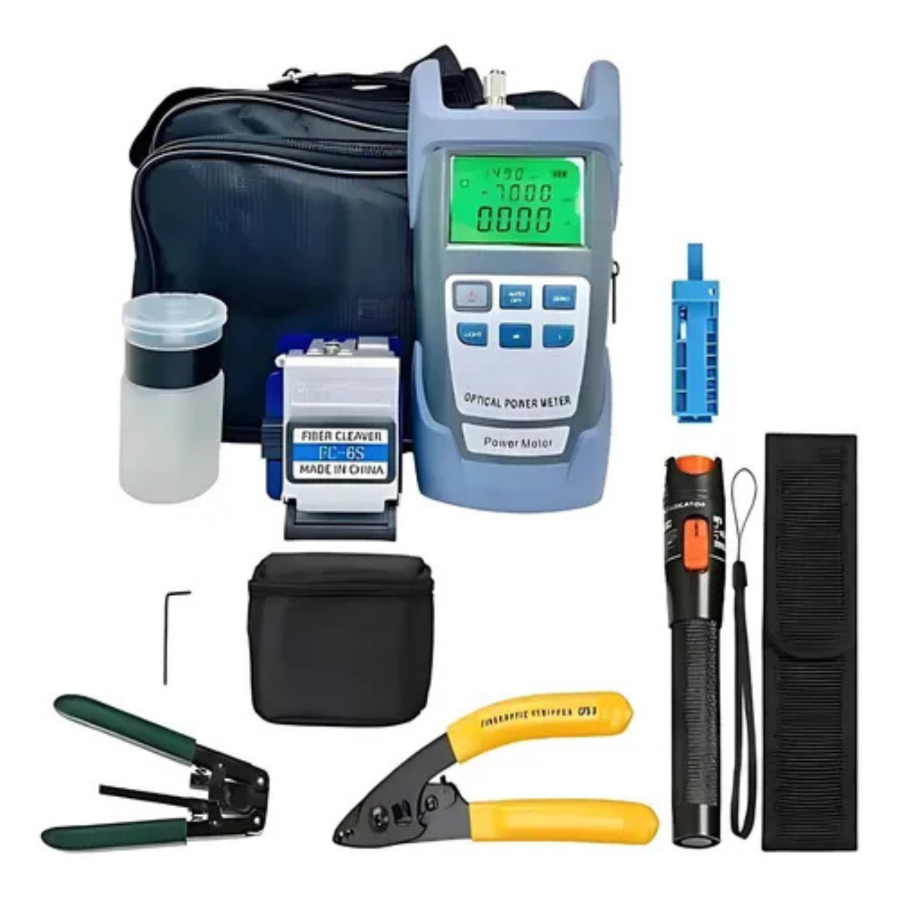 ITENS INCLUSOS:- 01 Medidor de Potência Power Meter (FC/SC);- 01 Identificador Visual de Falhas (caneta óptica);- 01 Clivador;- 01 Alicate Decapador;- 01 Alicate Descascador (Fibra Drop);- 01 Recipiente para álcool;- 01 Gabarito de conectorização;- 01 Bolsa para clivador;- 01 Bolsa para o kit;